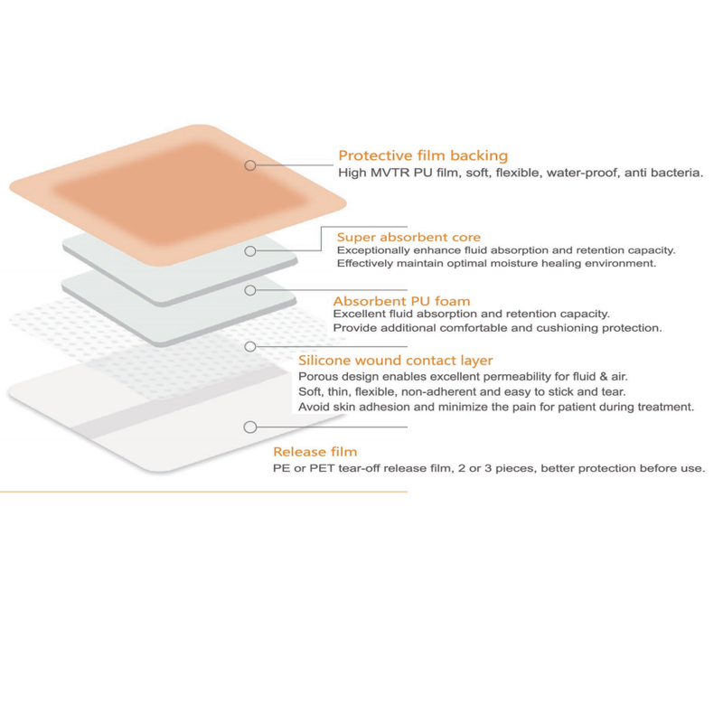 Bordered slicone foam dressing ay isang self adhering dressing na may karagdagang bordered edge na binubuo ng protective flm backing,super absorbent core,absorbent PU foam,siicone wound contact layer at release fim.