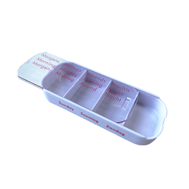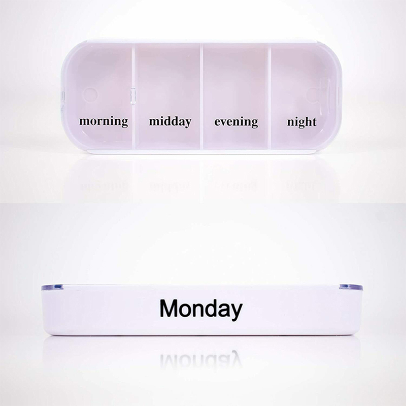 Ang bawat tray ay nakalaan para sa isang araw ng linggo at may apat na compartment na may label sa umaga, tanghali, gabi at gabi.