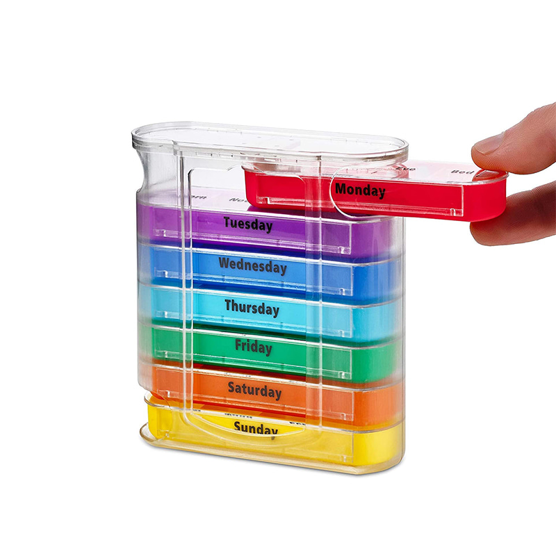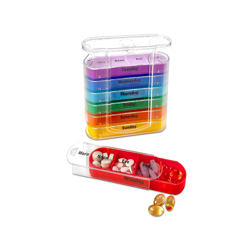 Ang panlabas na case ay dinisenyo na transparent at ang bawat tray ay may natatanging maliwanag na kulay para madaling makilala ng user ang mga araw ng linggo.
