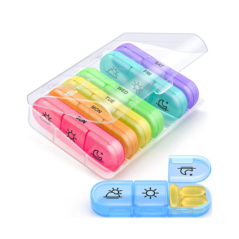 Ang premium na pill container na ito ay nilagyan ng mataas na kalidad na solid-state na ABS external holder at mataas na kalidad na food-grade PP daily pill box organizer.