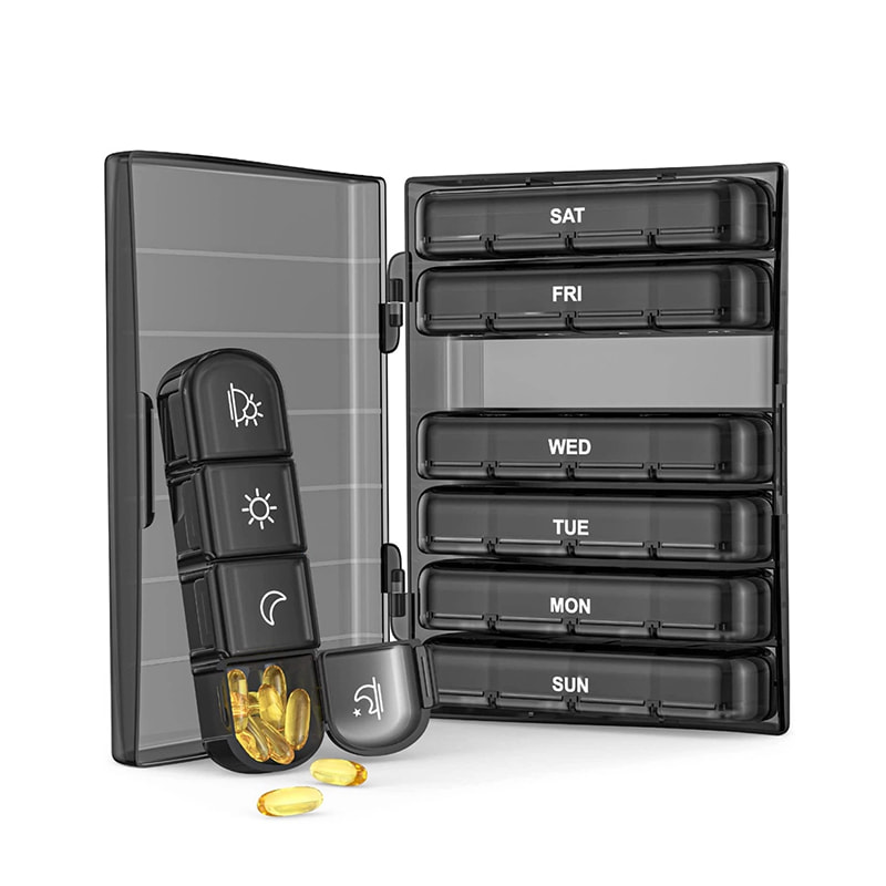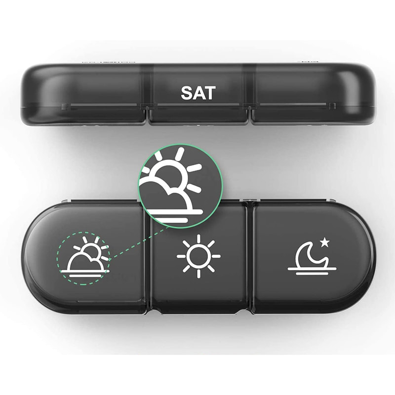 Ang mas malaking itim na shell ay kayang tumanggap ng 7 independiyenteng pill box organizer para planuhin ang mga tabletas sa loob ng isang linggo.