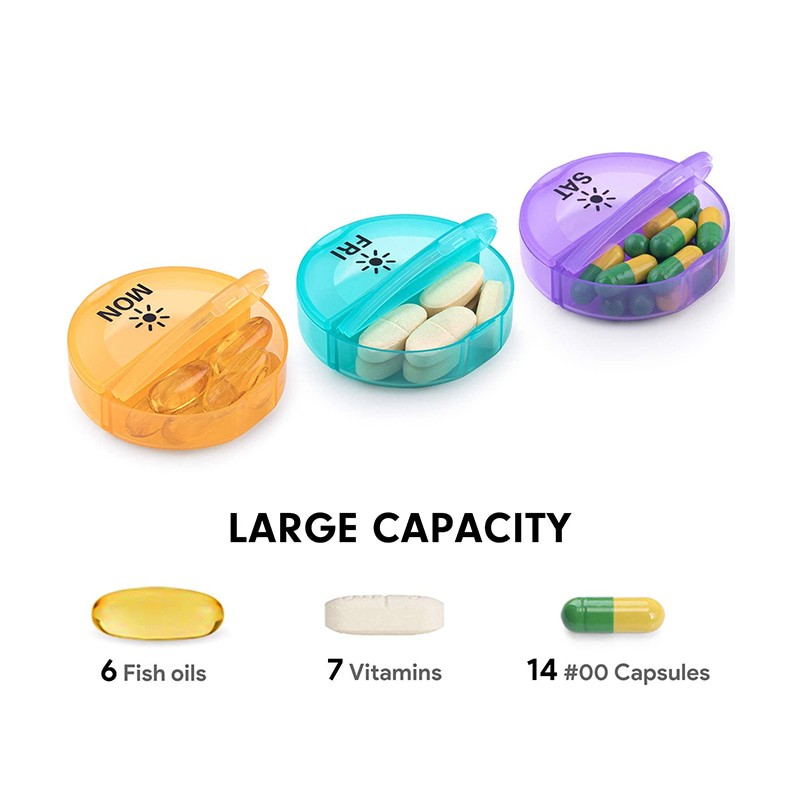 Ang panlabas na matibay na lalagyan ng kahon at mga food-grade 7 na pang-araw-araw na pill box ay nagpapanatili ng iyong gamot na ligtas.
