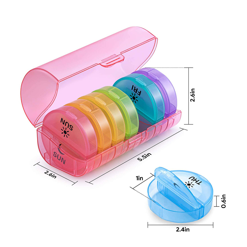 Nagbibigay-daan sa iyo ang 7 indibidwal na pang-araw-araw na mga kahon na may 7 kulay na makalabas ng solong o ilang araw na gamot na iinumin kapag nasa labas ka.