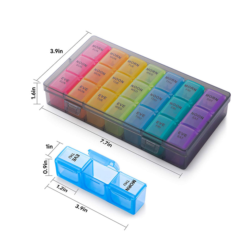 Lingguhang 7 araw na mga tampok ng pill organizer na may malaking espasyo, ang bawat compartment ay maaaring mag-imbak ng 6 na langis ng isda/ 6 na bitamina.
