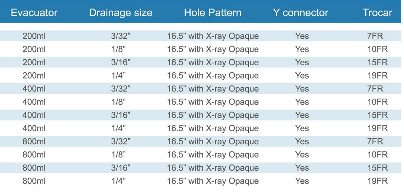 * Ang aming closed wound drainage system, kabilang ang 400cc3-spring evacuator,·PVC tubing at "Y" connector, at drain gamit ang trocar.